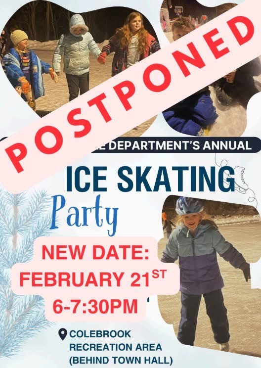 Next weekend is the Colebrook Fire Department’s annual ice skating party. It will be held on Saturday, February 7th, from 6-7:30 p.m. at the Colebrook Recreation Area (behind Town Hall). Come skate under the lights and enjoy hot cocoa, donuts and a warm fire.