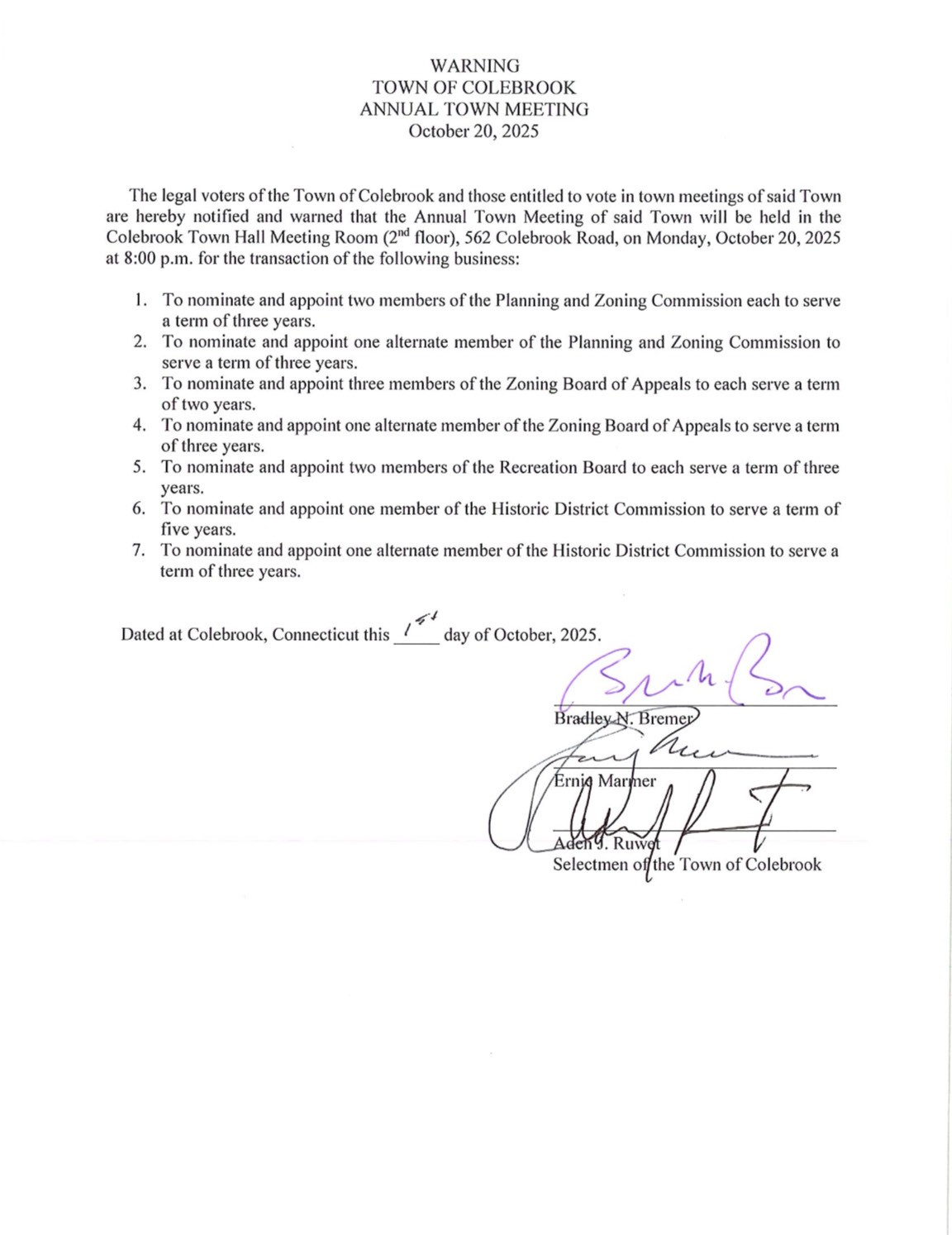 Emails are sent out from the 1st Selectman's office with this type of information and more as appropriate. If you would like to be on the list to receive these emails, contact Karen Odell at 860-379-3359 x 201 or kodell@colebrooktownhall.org.
